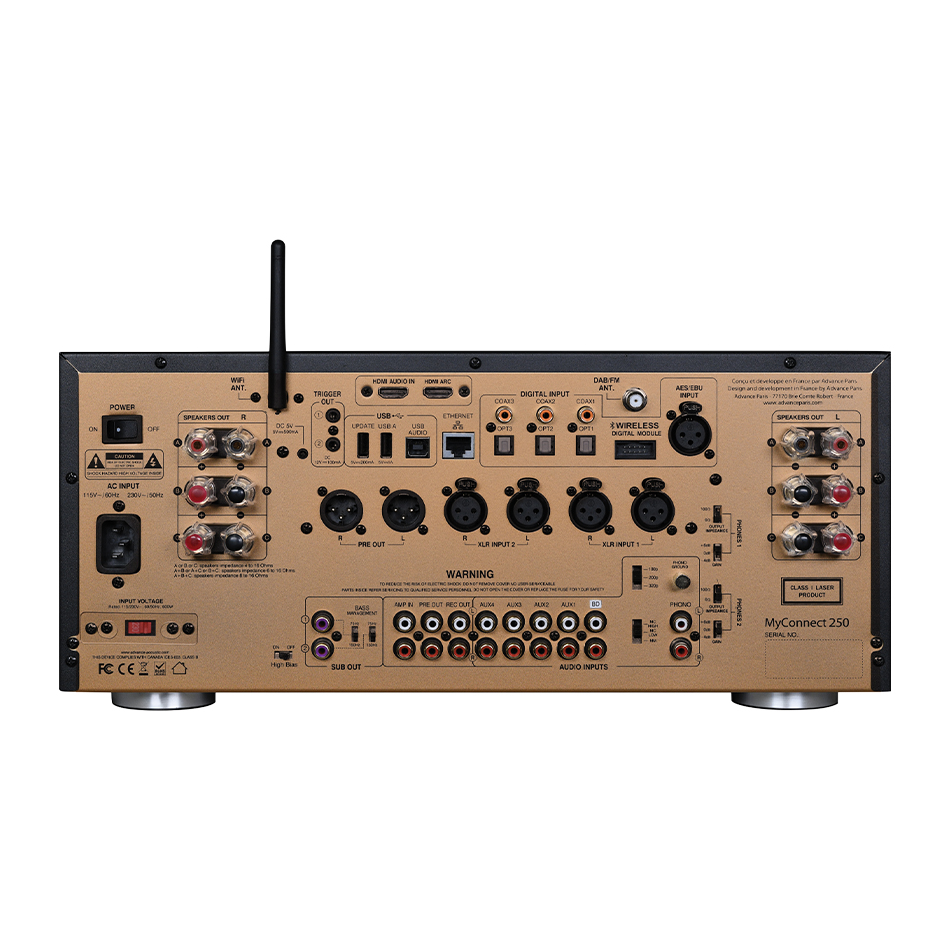 There’s a lot to say about MyConnect 250’s connectivity… From HDMI to Phono (MM/MC), analog RCA to AES-EBU, USB for computer to multiple optical and coaxial inputs, 3 speaker zones, network (Wi-Fi / Ethernet) and Bluetooth (optional with X-FTB01 / X-FTB02). Of course, it cannot be a MyConnect product if it does not include a CD player and a FM/DAB tuner.