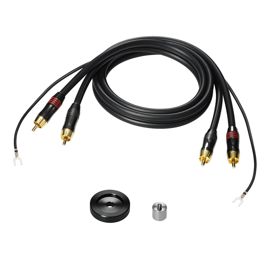 The turntable comes with a detachable RCA output cable (dual RCA male to dual RCA male with ground), 45 RPM adapter, and removable hinged dust cover.
