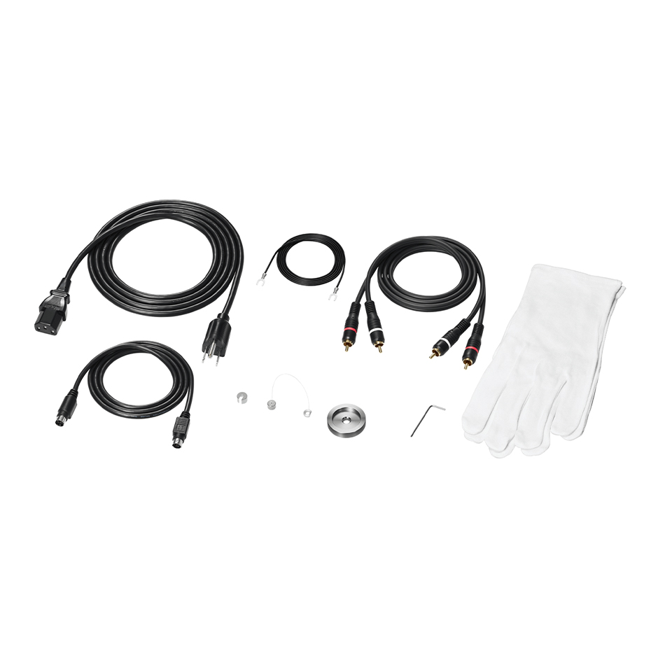 • Accessories Included: Control unit, Dust cover, Platter, Drive belt, Dust cover hinges, Counterweight (light), Counterweight (heavy), Weight for anti-skate, Auxiliary weight for anti-skate, Headshell with MC stereo cartridge (AT-OC9XEN), 45 RPM adapter, RCA audio cable (approx. 1.1 m (3.6’)), Power cable (approx. 1.8m (5.9’)) *, Control cable (approx. 1.0 m (3.3’)), Ground cable (approx. 1.1 m (3.6’)), Hexagonal wrench, Gloves